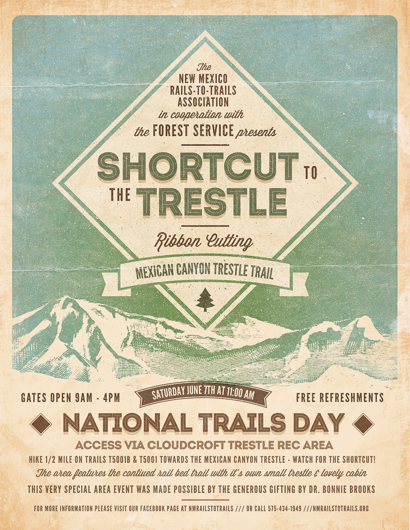 On Saturday, June 7, National Trails Day, our New Mexico Rails to Trails Association will host the inaugural opening and ribbon cutting of a section of the original rail road bed previously unavailable to the public. This pristine 800 foot stretch of rail-trail is located just up-trail from the Mexican Canyon Trestle, and contains is own trestle and a beautiful, quaint cabin. Gates will open at 9 am, with a short ribbon-cutting ceremony at 11 am, and close at 4 pm. Displays and refreshments will be available. This shortcut will only be open to the public on select days during the summer/fall season.