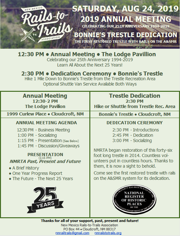August 18, 2019 by New Mexico Rails-to-Trails Association 2019 Annual Meeting Please join us for our annual meeting and trestle dedication, Saturday August 24th! Share this: Click to share on Facebook (Opens in new window) Facebook Click to share on X (Opens in new window) X Click to email a link to a friend (Opens in new window) Email Like Loading... Related