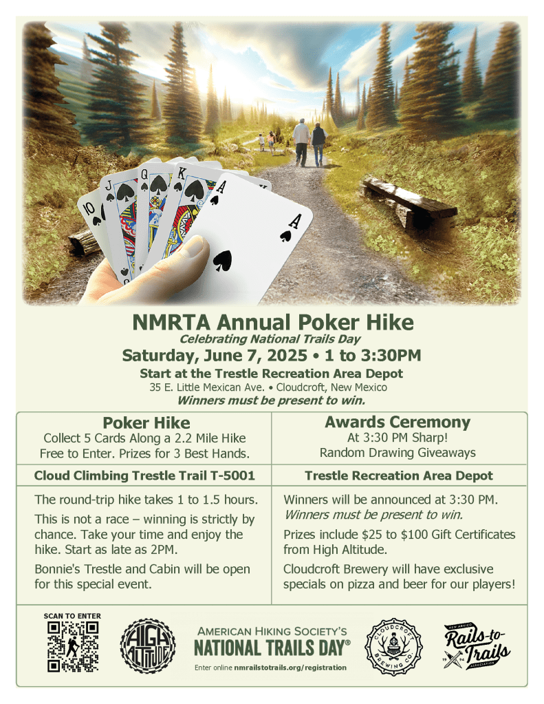 May 28, 2025 by New Mexico Rails-to-Trails Association Annual Poker Hike Saturday, June 7 Share this: Click to share on Facebook (Opens in new window) Facebook Click to share on X (Opens in new window) X Click to email a link to a friend (Opens in new window) Email Like Loading... Related