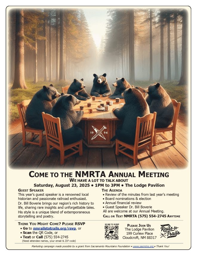 August 19, 2025 by New Mexico Rails-to-Trails Association Annual Meeting Saturday, August 23 • 1-3PM • The Lodge Pavilion • RSVP Here Share this: Click to share on Facebook (Opens in new window) Facebook Click to share on X (Opens in new window) X Click to email a link to a friend (Opens in new window) Email Like Loading... Related