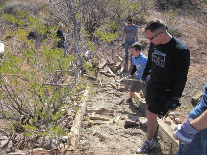 Wow what a wonderful day to work on a rail trail. Sunny. Warm. Lots of help. Twenty-four volunteers showed up, approximately half from Holloman Air Force Base. Nothing like having a group of strapping folks ready and willing to work. We claim that while helping us they are making themselves even more fit. We even had a 10-year old volunteer. Exciting. Maybe we have gained another young hiker. We had more folks than we were expecting, but the Forest Service brought plenty of trail working tools to keep everyone busy.