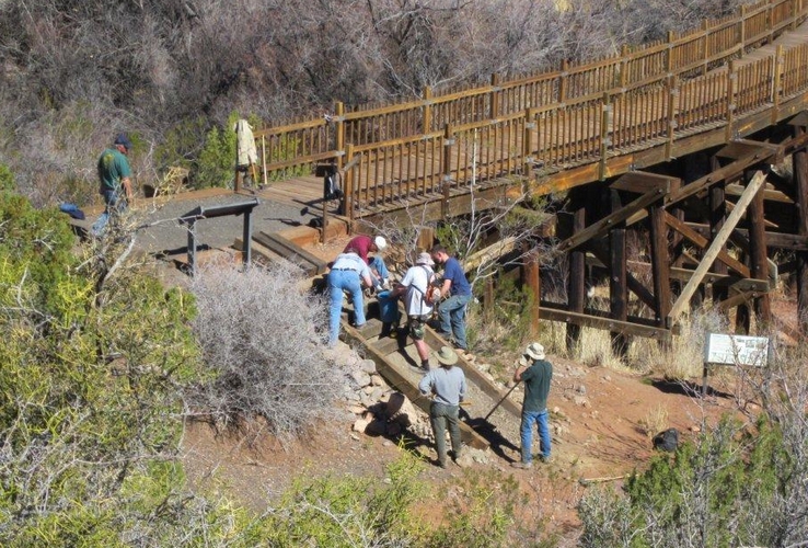 One team enjoyed the soothing sounds while replacing the stairs leading down to the interpretive sign. The original 10 steps, installed in 2006, were not made of railroad ties, and even though they were treated periodically and are in an arid climate they still weathered poorly. We were able to reuse the 9-inch nails and the 4-inch wide side rails used in the original construction. Now fitted with new railroad ties the steps are in fine shape. If you mosey on down that way to the sign you can see in the right side of the photo, you can learn about the names of all the lumber that makes up a trestle.